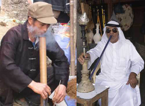 Hút thuốc theo kiểu điếu cày Việt Nam và hút theo kiểu shisha Ả-rập. Ảnh: Internet