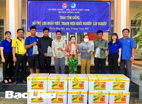 (BL-ĐKC) Huyện đoàn, Hội LHTN Việt Nam huyện Hồng Dân vừa phối hợp với Công ty TNHH phát triển thủy sản Bình Minh tổ chức trao 100.000 con tôm giống hỗ trợ đoàn viên - thanh niên khởi nghiệp, lập nghiệp, với tổng trị giá gần 16 triệu đồng (ảnh).