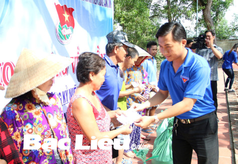 Anh Hà Phú Quí - Bí thư Huyện đoàn Vĩnh Lợi tặng quà cho hộ nghèo. Ảnh: H.L