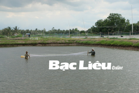 Nông dân huyện Đông Hải thu hoạch tôm công nghiệp. Ảnh: T.A