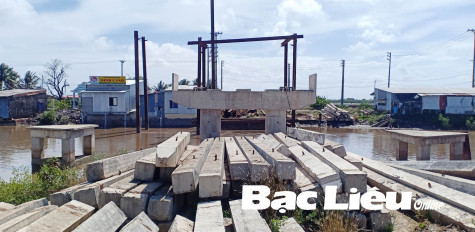 Cây cầu giao thông bắc qua kênh Cái Cùng dẫn về trung tâm xã Long Điền Đông (huyện Đông Hải) thi công ì ạch khiến người dân bức xúc. Ảnh: H.T