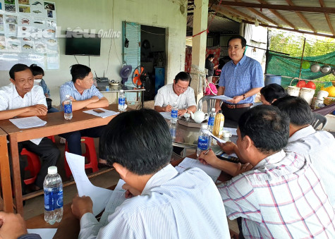 Đoàn công tác Huyện ủy Đông Hải làm việc với HTX Nuôi tôm công nghệ cao (xã Long Điền Đông) về việc thành lập chi bộ mới. Ảnh: T.T