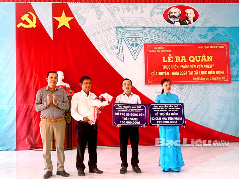 Các tổ chức, cá nhân trao bảng tượng trưng hỗ trợ huyện Đông Hải thực hiện Năm Dân vận khéo 2023 tại xã Long Điền Đông. Ảnh: T.T