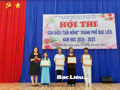 * Trước đó, trong ngày 21/12, Phòng GD-ĐT TP. Bạc Liêu cũng đã tổ chức thành công Hội thi “Giai điệu tuổi hồng” năm 2024 với sự tham gia của 262 học sinh đến từ các đơn vị trường THCS. Kết quả, Ban tổ chức đã trao giải Nhất tập thể cho đơn vị Trường THCS Trần Huỳnh, giải Nhì thuộc về Trường THCS Võ Thị Sáu, giải Ba thuộc về Trường THCS Bạc Liêu - Ninh Bình. Ngoài ra, Ban tổ chức cũng trao 5 giải Nhất, 5 giải Nhì, 5 giải Ba và 10 giải Khuyến khích cho các cá nhân có tiết mục xuất sắc.