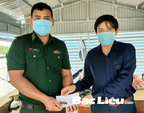 Ông Nguyễn Văn Chung - Chủ tịch UBND huyện Hòa Bình (bên phải) trao tiền hỗ trợ chốt kiểm dịch COVID-19 tại cửa biển Cái Cùng (xã Vĩnh Thịnh). Ảnh: H.Đ