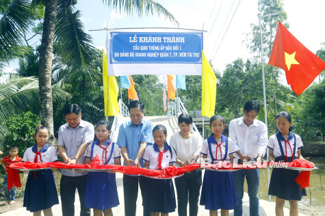 Phó Chủ tịch UBND huyện Hòa Bình - Trần Minh Thới (thứ hai từ trái sang) và nhà tài trợ cắt băng khánh thành cầu giao thông nông thôn trên địa bàn huyện.