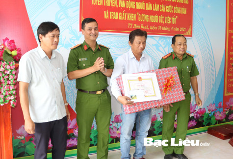 Sáng 25/4, Công an huyện Hòa Bình phối hợp với Công an huyện thị trấn Hòa Bình tổ chức trao giấy khen và tiền thưởng của Chủ tịch UBND huyện Hòa Bình cho ông Nguyễn Trường An (ấp Láng Giài, thị trấn Hòa Bình, huyện Hòa Bình) do có hành động đẹp, nhặt được của rơi trả cho người mất.