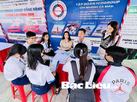 Doanh nghiệp tư vấn cho những người lao động có nhu cầu đi làm việc ở nước ngoài theo hợp đồng, tại Hội chợ việc làm huyện Hòa Bình năm 2024.