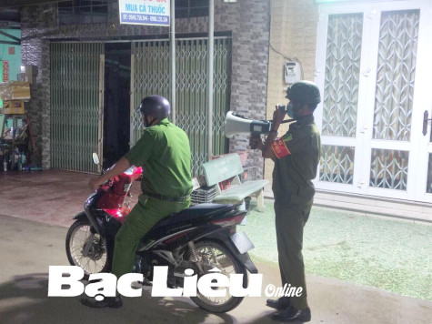 Công an huyện Hòa Bình tuyên truyền, kiểm soát người dân ra đường trong thời gian giãn cách xã hội.Ảnh: H.T