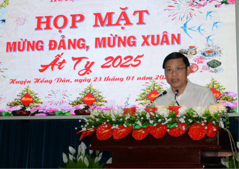 Tại buổi họp mặt, đồng chí Nguyễn Văn Chung - Bí thư Huyện ủy Hồng Dân khẳng định, trí tuệ và kinh nghiệm của đội ngũ cán bộ hưu trí, nhất là các đồng chí lãnh đạo, nguyên lãnh đạo tỉnh và huyện Hồng Dân qua các thời kỳ, bằng nhiệt tình cách mạng, bằng tình cảm, tâm huyết và trách nhiệm đối với quê hương Hồng Dân, sẽ tiếp tục quan tâm, trao truyền những kinh nghiệm quý báu để Hồng Dân ngày càng phát triển hơn nữa. Đồng chí Bí thư Huyện ủy gửi lời chúc mừng Xuân mới đến các đại biểu tham dự họp mặt, đồng thời mong muốn tất cả cán bộ, đảng viên và Nhân dân huyện nhà khơi dậy khát vọng phát triển và lòng yêu quê hương; khuyến khích tính năng động, sáng tạo và tinh thần dám nghĩ, dám làm, dám chịu trách nhiệm để tiếp tục xây dựng quê hương Hồng Dân phát triển giàu mạnh.