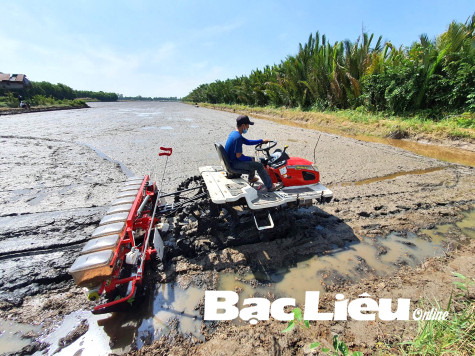 Nông dân sạ lúa bằng máy ở thị trấn Ngan Dừa (huyện Hồng Dân). Ảnh: C.L