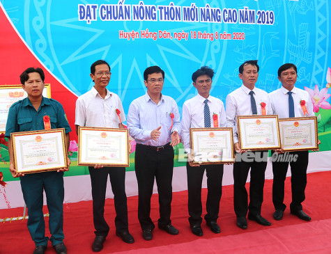 Khen thưởng cán bộ, đảng viên có thành tích xuất sắc trong xây dựng nông thôn mới. Ảnh: T.H