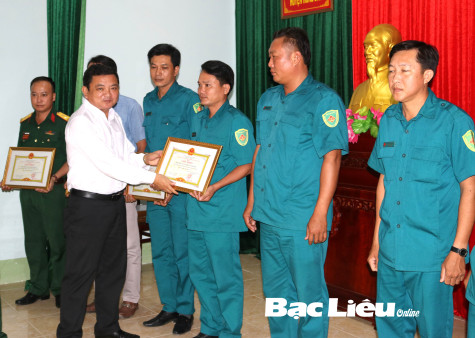 Ông Nguyễn Văn Thới - Chủ tịch UBND huyện Hồng Dân, Chủ tịch Hội đồng NVQS huyện trao giấy khen cho các tập thể có thành tích xuất sắc.