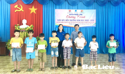 Bí thư Huyện đoàn Phước Long - Ngô Thị Như Ý trao học bổng cho học sinh có hoàn cảnh khó khăn trên địa bàn huyện. Ảnh: H.L