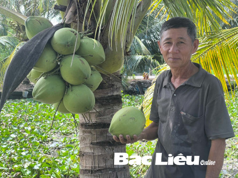 Ông Tăng Văn Hoàng bên hàng dừa đang cho trái của gia đình. Ảnh: C.L