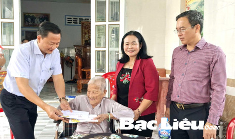 Lãnh đạo Huyện ủy, UBND huyện Vĩnh Lợi thăm, tặng quà và chúc Tết Mẹ Việt Nam anh hùng Ngô Thị Năm (ấp Giồng Bướm A, xã Châu Thới, huyện Vĩnh Lợi).
