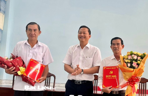 Bí thư Huyện ủy Vĩnh Lợi - Trương Thanh Nhã (giữa) trao quyết định cho đồng chí Trần Văn Việt và đồng chí Nguyễn Văn Đượm. Ảnh: M.Đ