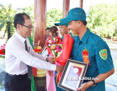 Phó Bí thư Huyện ủy Vĩnh Lợi - Phan Văn Sáu trao biểu trưng cho tập thể điển hình học tập và làm theo tư tưởng, đạo đức, phong cách Hồ Chí Minh. Ảnh: T.T
