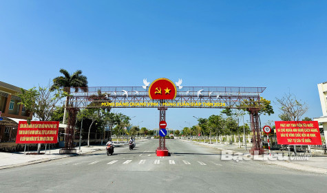 Cổng chào vào Huyện ủy Vĩnh Lợi được trang trí, trang hoàng mừng Đảng quang vinh, mừng Xuân Giáp Thìn 2024. Ảnh: H.L