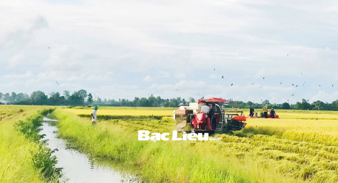 Nông dân huyện Vĩnh Lợi thu hoạch lúa bằng máy gặt đập liên hợp. Ảnh: H.L