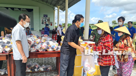 Ông Lưu Văn Liêm - Bí thư Huyện ủy Vĩnh Lợi trao quà cho đồng bào Khmer xã Hưng Hội (huyện Vĩnh Lợi). Ảnh: M.Đ