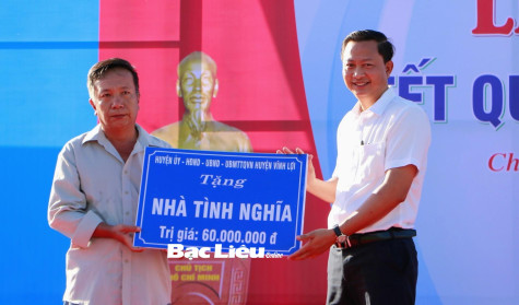 Bí thư Huyện ủy Vĩnh Lợi - Trương Thanh Nhã trao bảng tượng trưng tặng nhà tình nghĩa cho gia đình chính sách xã Châu Thới.