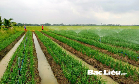 Mô hình đưa màu xuống ruộng và ứng dụng công nghệ phun sương ở xã Hưng Hội (huyện Vĩnh Lợi).