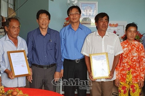 | Ông Nguyễn Quốc Thanh, Bí thư Huyện ủy Trần Văn Thời động viên gia đình ông Gắng (giữa) và ông Thêm tiếp tục ra sức lao động, cải thiện đời sống gia đình, vận động con cháu chăm lo học hành, chí thú làm ăn, góp phần xây dựng quê hương thêm giàu đẹp. |