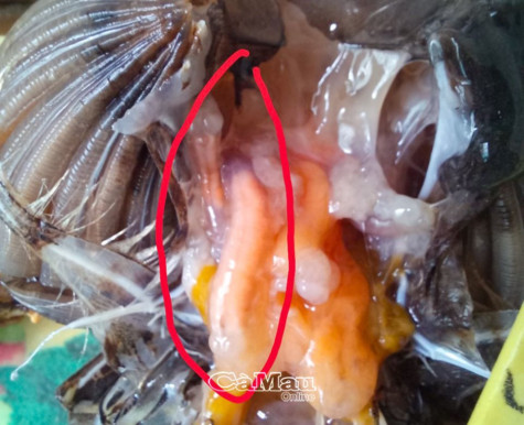 | Cua bị nhiễm giáp xác chân tơ với tỷ lệ rất cao (88,9%), cường độ nhiễm từ 1 - 8 ký sinh/cua. Ảnh giáp xác chân tơ trưởng thành từ mẫu cua chết tại huyện Ngọc Hiển. |