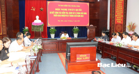 Quang cảnh hội nghị trực tuyến toàn quốc sơ kết công tác kiểm tra, giám sát 6 tháng đầu năm 2023 tại điểm cầu tỉnh Bạc Liêu. Ảnh: K.P