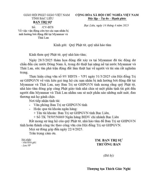 Thực hiện công văn 95, ngày 31/3/2025 của Hội đồng Trị sự GHPGVN về việc kêu gọi ủng hộ các nạn nhân bị ảnh hưởng bởi động đất tại Myanmar và Thái Lan, nay Ban Trị sự GHPGVN tỉnh mong rằng quý phật tử, nhà hảo tâm đóng góp cùng Phật giáo tỉnh nhà chia sẻ một phần tịnh tài gửi đến người dân Myanmar và Thái Lan nhằm san sẻ một phần nào những mất mát, đau thương mà họ gánh chịu.