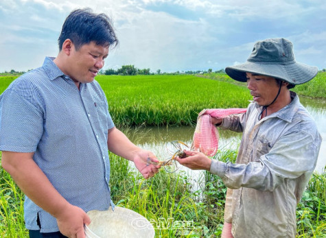 | Ông Hồng Lý, ấp Nguyễn Huế, xã Tân Bằng, kiểm tra tôm nuôi trong ruộng lúa. |