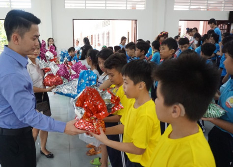 | Ông Nguyễn Thanh Duy, Phó tổng giám đốc Công ty Cổ phần Thương mại - Dịch vụ - Du lịch Phú Cường, tặng quà và chúc mừng Tết Trung thu các em ở Trung tâm Nuôi dạy trẻ khuyết tật - mồ côi Nhân Ái. |