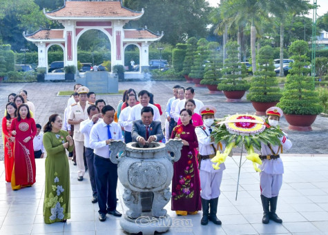 | Trước phiên khai mạc kỳ họp, đại biểu HĐND tỉnh đến viếng và dâng hương, dâng hoa tại Khu tưởng niệm Chủ tịch Hồ Chí Minh (Phường 1, TP Cà Mau). |