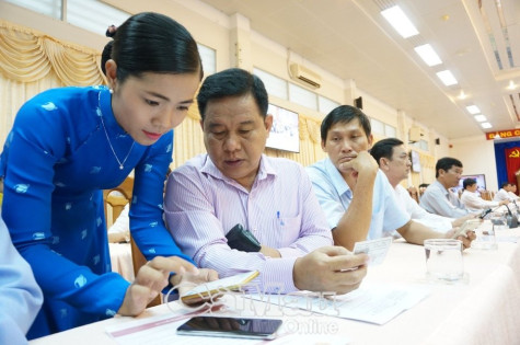 Nhân viên VNPT Cà Mau hướng dẫn các đại biểu tạo tài khoản trên Cổng Dịch vụ công Quốc gia