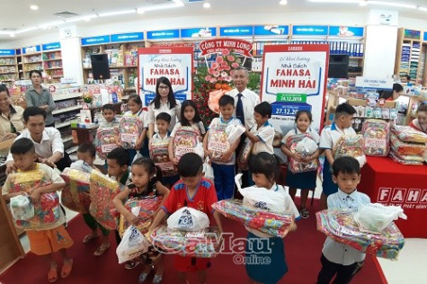 | Tại lễ khai trương, Fahasa Minh Hải đã trao tặng 20 suất quà cho học sinh nghèo Phường 1, TP. Cà Mau. |