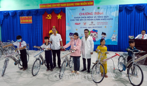 Bác sĩ Võ Thành Lợi (bên trái), Giám đốc Bệnh viện Sản - Nhi Cà Mau và Thạc sĩ Phạm Mạnh Tiến, Phó chủ tịch Công đoàn Bệnh viện Nhi Đồng 1, trao tặng xe đạp cho các em học sinh có hoàn cảnh khó khăn.