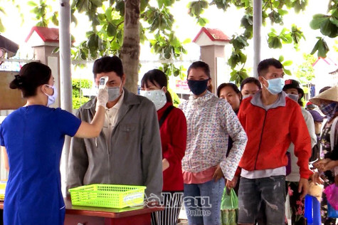 | Bệnh nhân xếp hàng kiểm tra thân nhiệt khi đến Bệnh viện Đa khoa Cái Nước khám bệnh. |
