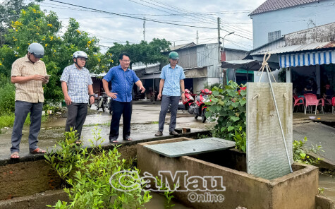 Chủ tịch UBND xã Năm Căn Võ Văn Hành (bìa phải), cùng lãnh đạo các cơ quan chuyên môn xã nắm tình hình hoạt động cống thoát nước trên đường Nguyễn Tất Thành (ngang Nghĩa trang Liệt sĩ Năm Căn).