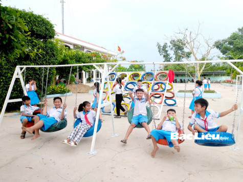 Các em học sinh Trường tiểu học B xã Vĩnh Thanh (huyện Phước Long) thích thú với các trò chơi trong công trình.