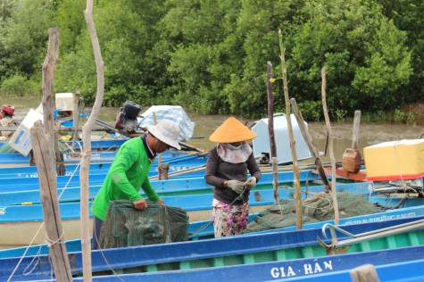 Từ khi về đây, mỗi con nước đi ghe gần nửa tháng, về được trả 3-4 triệu đồng. Anh Khương mừng: “Ở trong căn nhà mới cất hơn 4 tháng nay, tui mới yên tâm đi làm, không lo sập nhà nữa. Có tuyến đê bảo vệ, đi tới lui cũng thuận tiện nữa. Mấy đứa nhỏ đi học bên trường giáp ranh, chứ từ đây chạy ra xã đi học thì xa quá”. Bưng mấy ly trà đường ra để trên bàn đãi khách, chị Kiều tiếp lời: “Phụ nữ ở đây không có sở gì làm. Nhà thưa thớt, không có doanh nghiệp nào thuê mướn, ở nhà trông con đi học, đợi chồng đi biển về nuôi. Có ghe vô mới đi lột mực, lựa tôm, cá, một ngày kiếm một, hai trăm ngàn, cũng đỡ”.