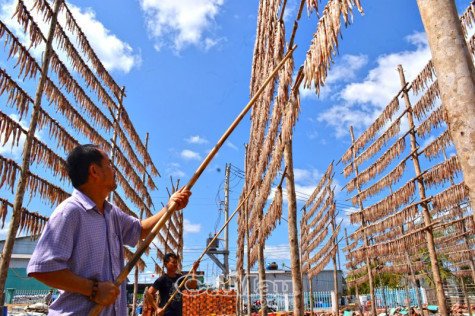 | Ông Đinh Hoàng Vân, Khóm 5, thị trấn Cái Đôi Vàm gầy dựng được cơ ngơi ổn định từ nghề làm cá khô khoai. |