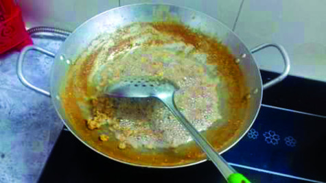 "Cứt dừa" được mẹ vớt để lên cái vỉ đặt một bên miệng chảo để dầu dừa chảy xuống chảo không hao hụt. Khi mặt chảo không còn nổi lên những nhúm bột màu nâu đen là lúc chảo dầu dừa đã thắng xong.