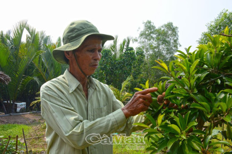 | Ông Nguyễn Văn Đông, ấp Tân Hiệp, xã Tân Dân đang chăm sóc vườn cây ăn trái của gia đình. |
