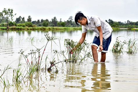 | Ốc bươu vàng cộng với lượng mưa khá lớn gây nhiều khó khăn cho lúa hè thu ở huyện Trần Văn Thời. Ảnh: Nhật Minh |