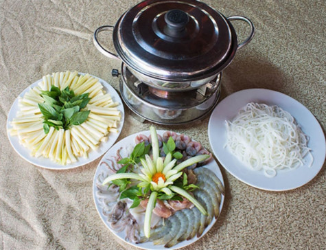 Tất cả nguyên liệu gồm: mực, tôm, lươn, cá, nghêu, chả cá… được cho vào một cái đĩa sâu lòng trang trí đẹp mắt với rau củ tỉa hoa. Ở một cái đĩa khác là các loại rau như: rau muống, quế, bồn bồn, năn bộp…, tùy mùa vụ thu hoạch, nhưng chủ yếu cũng chỉ là “hương đồng cỏ nội”.
