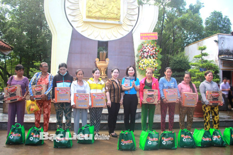 Chủ tịch Hội LHPN tỉnh - Lê Thị Ngọc Linh (thứ 5 từ phải sang) trao quà cho hội viên, phụ nữ xã Long Điền (huyện Đông Hải). Ảnh: T.T