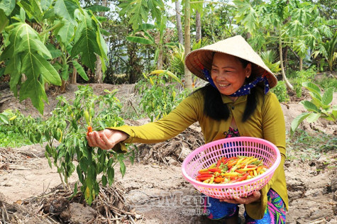 | Mạnh dạn chuyển đổi 1 ha đất trồng lúa sang trồng ớt và các loại cây ăn trái giúp chị Nguyễn Thị Sen tăng thu nhập, nâng cao chất lượng cuộc sống. |