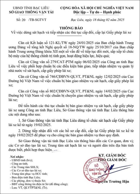 Ngày 18/2, Sở Giao thông - Vận tải (GT-VT) Bạc Liêu ban hành Thông báo 20 về việc dừng sát hạch và tiếp nhận các thủ tục cấp đổi, cấp lại Giấy phép lái xe (GPLX) từ ngày 19/2/2025. Thông tin trên nhận được sự quan tâm của người dân trên địa bàn tỉnh, nhất là những người đang có nhu cầu thi sát hạch, xin cấp đổi, cấp lại GPLX.