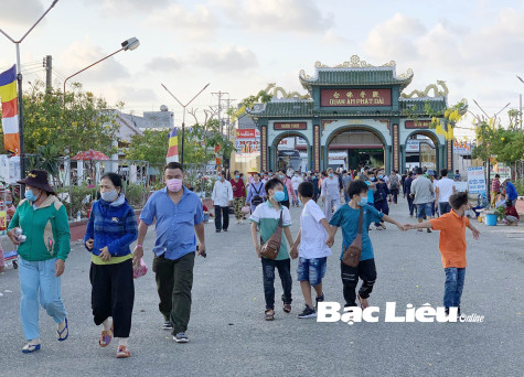 Khách hành hương tuân thủ quy định đeo khẩu trang tại Khu Quán âm Phật đài (phường Nhà Mát, TP. Bạc Liêu). Ảnh: H.T